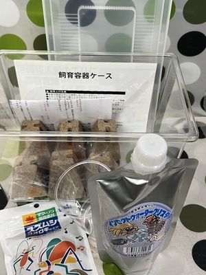 コオロギ飼育セットはコオロギのエサやシェルターなどコオロギ飼育にあると便利なものをまとめたセットです。プラケースのサイズはS、M、Lがあります。