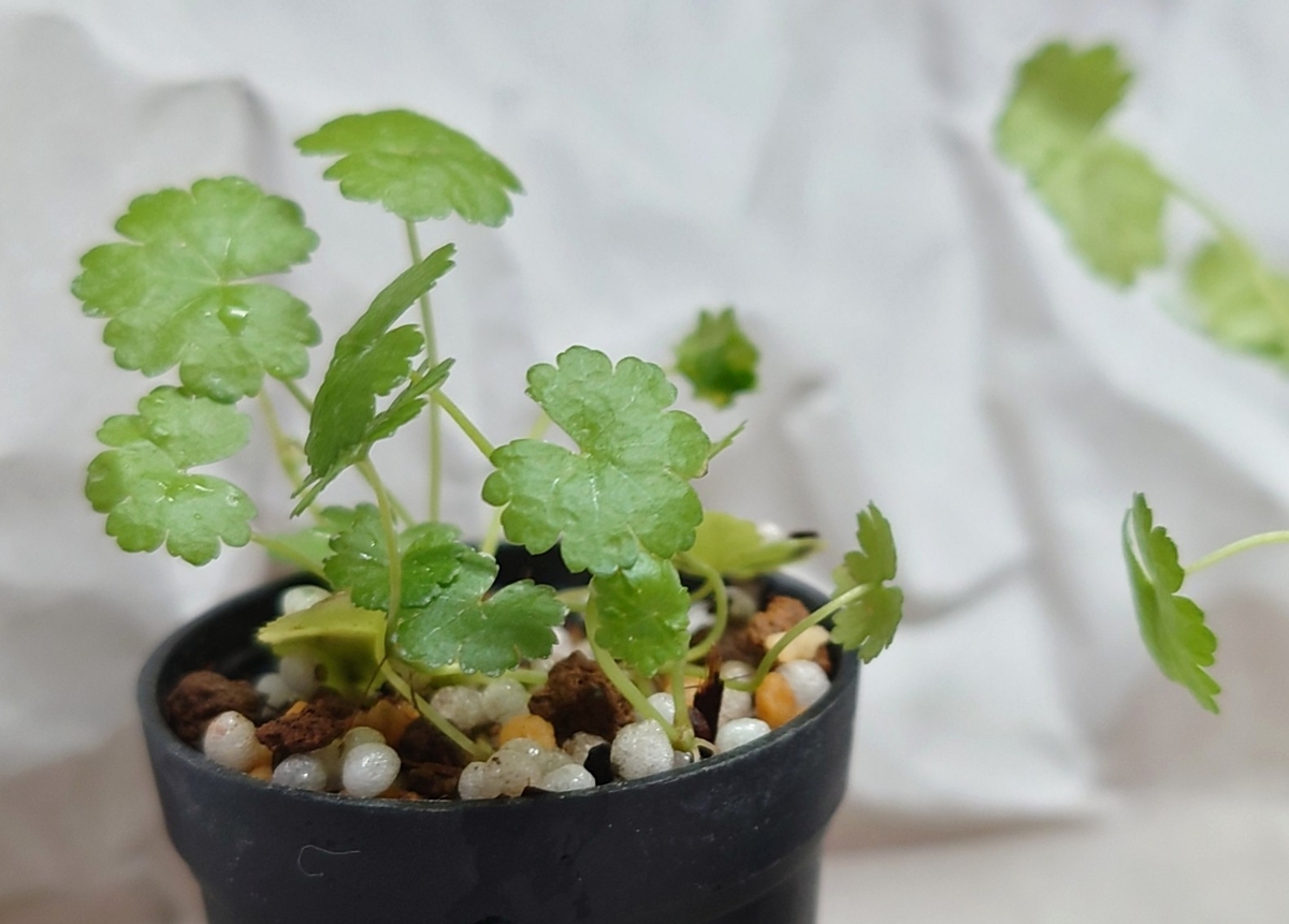 鹿児島産の小型チドメグサ。10ミリ弱の丸い葉が密に茂り、ビバリウムやコケリウムで小さな藪のような景観をつくる苗