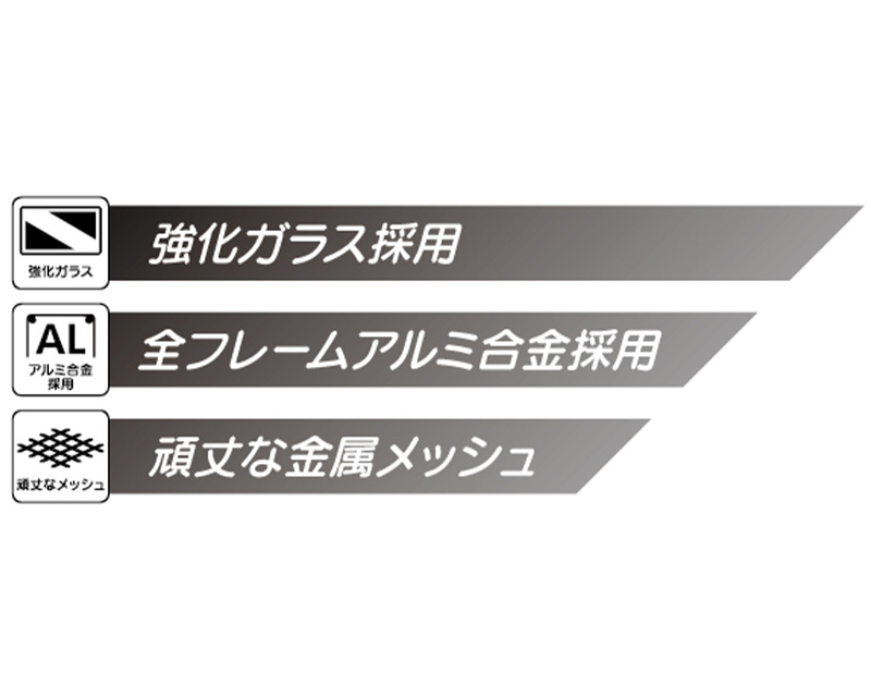 全面強化ガラスに頑丈な金属メッシュ、フレームはアルミ合金を採用しています。スイングドア支柱をケージのフレームと一体化させることで開口部を広く確保しています。